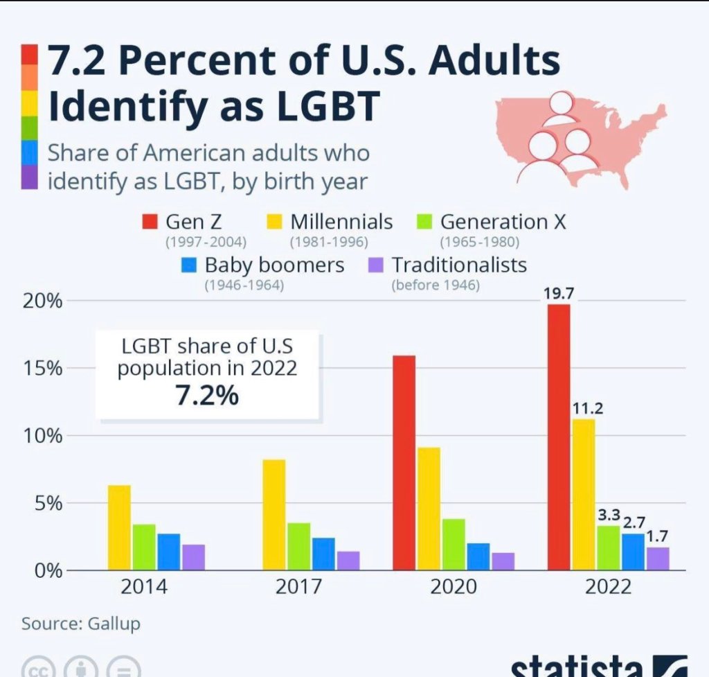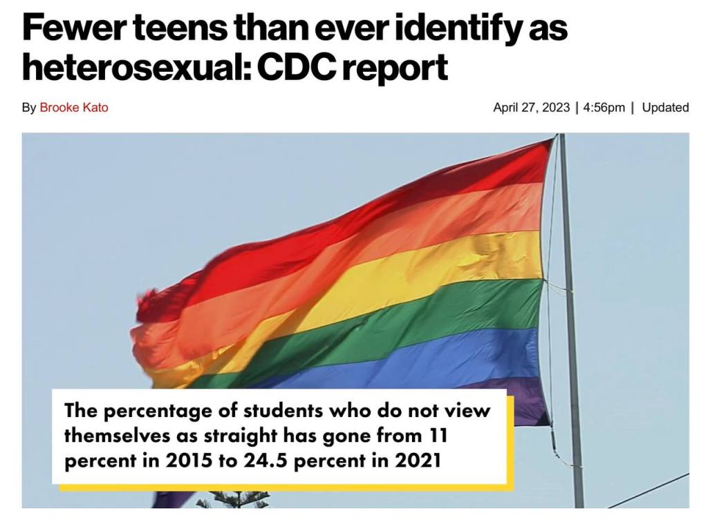 The Western liberal mind is a twisted, godless perspective where the only moral value is absolute personal liberty as long as another human isn’t being victimized through violence. They see an objection based on divine authority to the unnatural (such as the belief homosexuality or bestiality is wrong) as immoral and indicative of low intelligence and superstition, but in the very next breath they argue a person can be trapped in the wrong gender body. Trans* ideology very much requires a type of religious faith and the cherishing of absolute personal liberty above protecting purity and functional institutions like marriage and chastity. Originally, when American Christians accepted the homosexuals, the reasoning was “love is love” and that no actual harm was being done to society through homosexuality. After all, the dominant belief is that people are “born gay” or at the very least know they are gay while still prepubescent. But if this is true then why is the rate of LGBTQ+ amongst children rising dramatically?