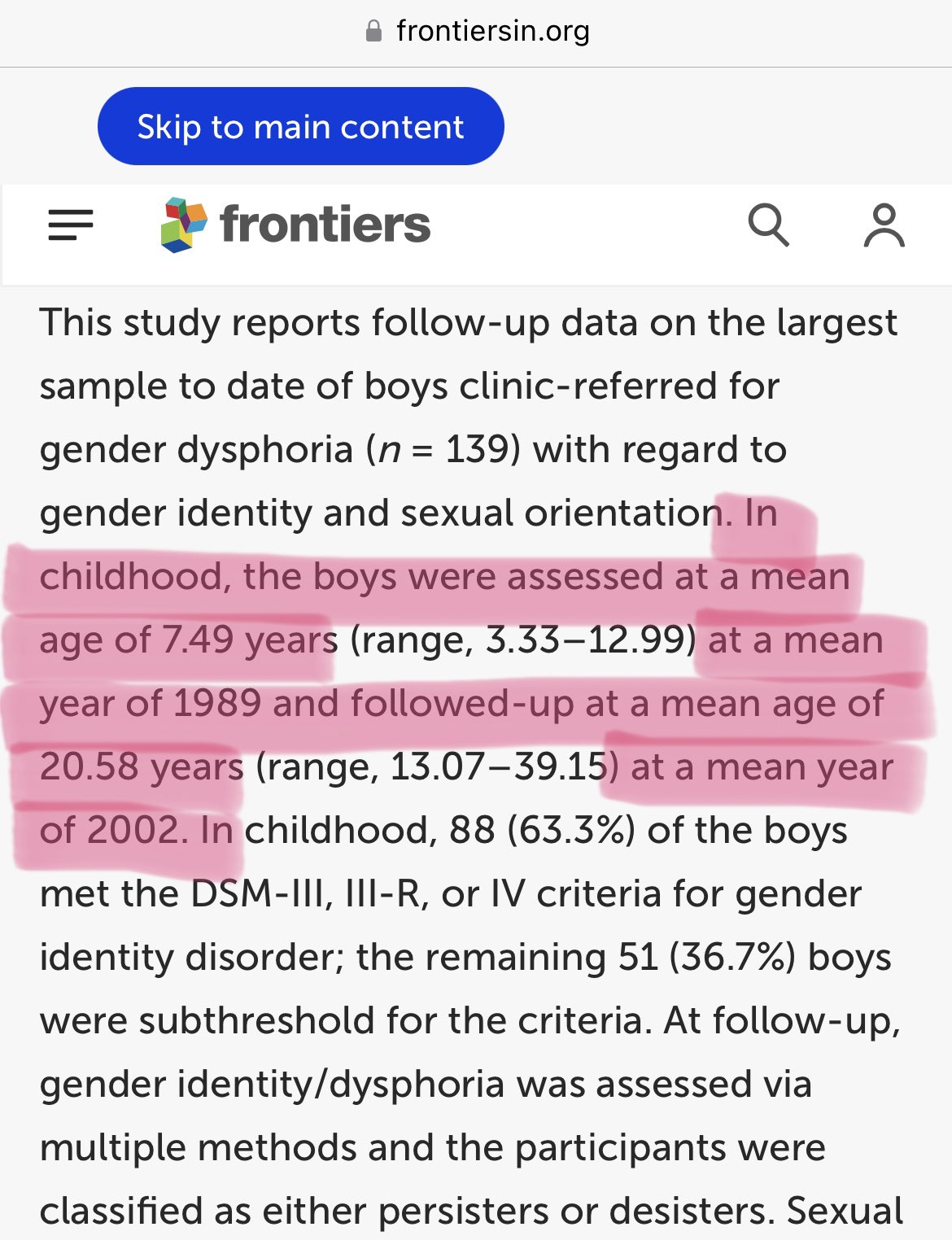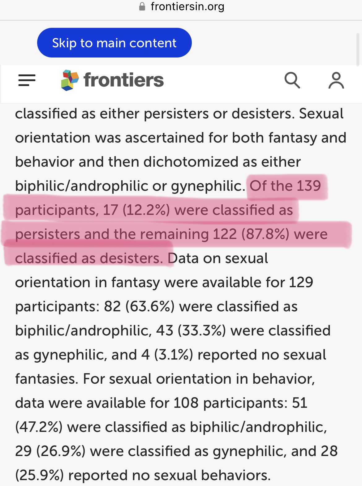 In this study it is demonstrated that 88 out of 139 (63.3%) of the boys studied met the DSM-III, III-R, or IV criteria for gender identity disorder. The DSM is the book of “official mental diagnoses” by psychologists, and the labels are all decided by peer consensus not any kind of objective science. Of those 88 boys, when classified as either persisters (still trans) or desisters (identifies by biological sex) only 12.2% (17 boys) were classified as persisters (still met criteria of gender identity disorder) at follow-up. No gender affirming care was provided to anyone represented in this study during the time of the study.